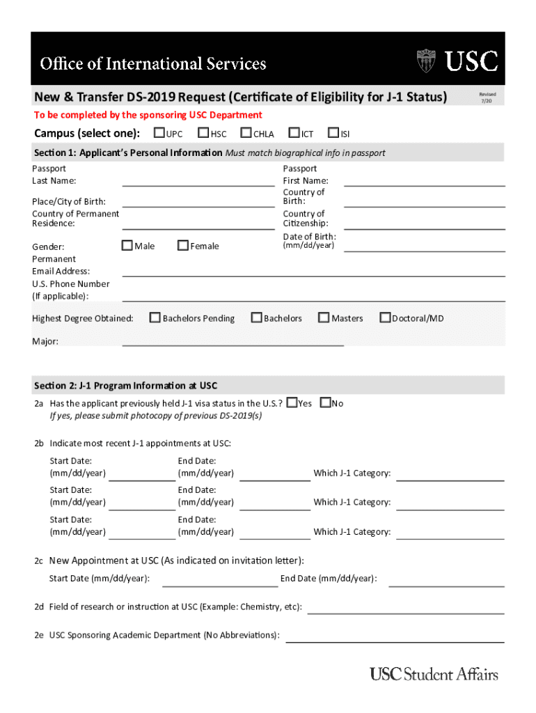 New & Transfer DS2019 Request (Certificate of Eligibility for J1 Status) To be completed by the sponsoring USC DepartmentCampus (select one): UPC HSC COLA ICT Dissection 1: Applicants Personal Information