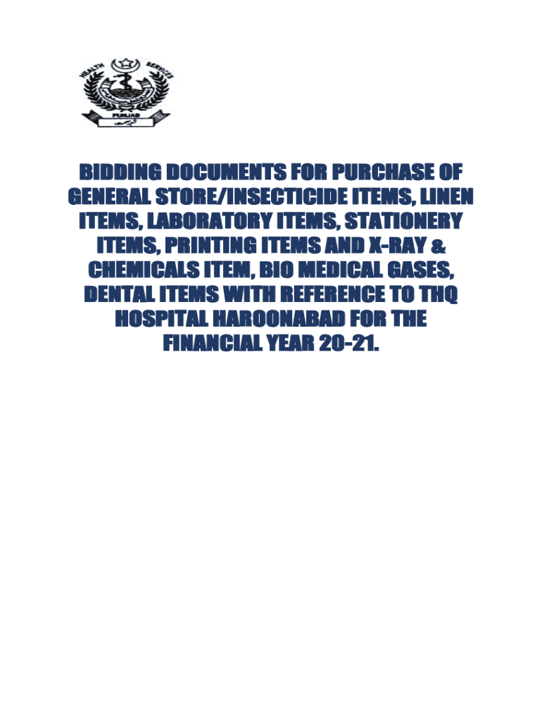 BIDDING DOCUMENTS FOR PURCHASE OF GENERAL STORE/INSECTICIDE ITEMS, LINEN ITEMS, LABORATORY ITEMS, STATIONERY ITEMS, PRINTING ITEMS AND RAY & CHEMICALS ITEM, BIO MEDICAL GASES, DENTAL ITEMS WITH REFERENCE