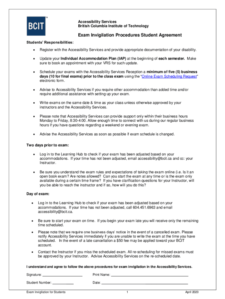 Accessibility Services British Columbia Institute of TechnologyExam Invigilation Procedures Student Agreement Students Responsibilities: Register with the Accessibility Services and provide appropriate