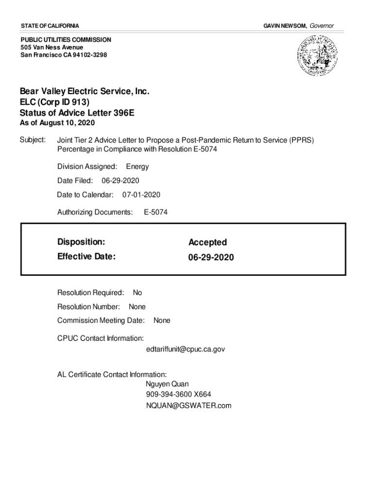GAVIN NEWSOM, Governorate OF CALIFORNIAPUBLIC UTILITIES COMMISSION 505 Van Less Avenue San Francisco CA 941023298Bear Valley Electric Service, Inc. ETC (Corp ID 913) Status of Advice Letter 396E As