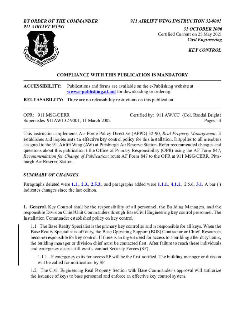 BY ORDER OF THE COMMANDER 911 AIRLIFT WING911 AIRLIFT WING INSTRUCTION 329001 31 OCTOBER 2006 Certified Current on 25 May 2021 Civil Engineering KEY CONTROLCOMPLIANCE WITH THIS PUBLICATION IS MANDATORY
