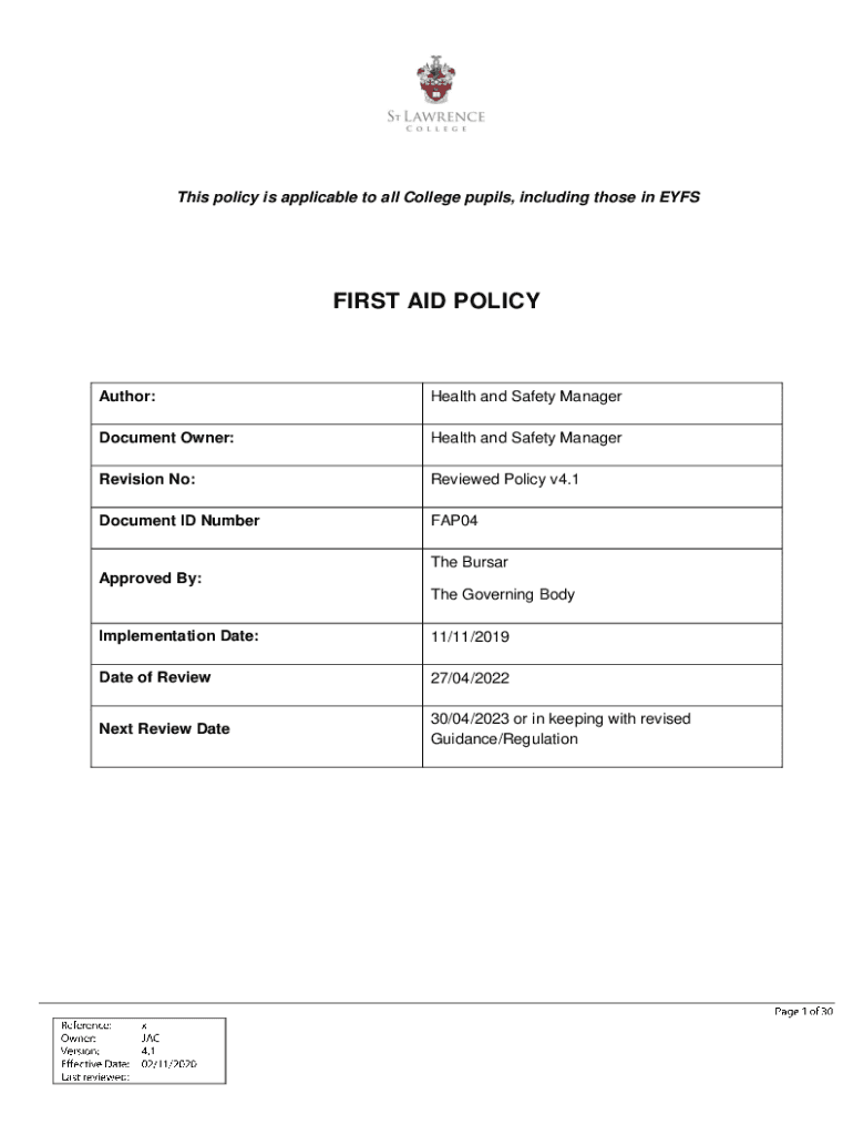 This policy is applicable to all College pupils, including those in EYFSFIRST AID POLICYAuthor:Health and Safety ManagerDocument Owner:Health and Safety ManagerRevision No:Reviewed Policy v4.1Document