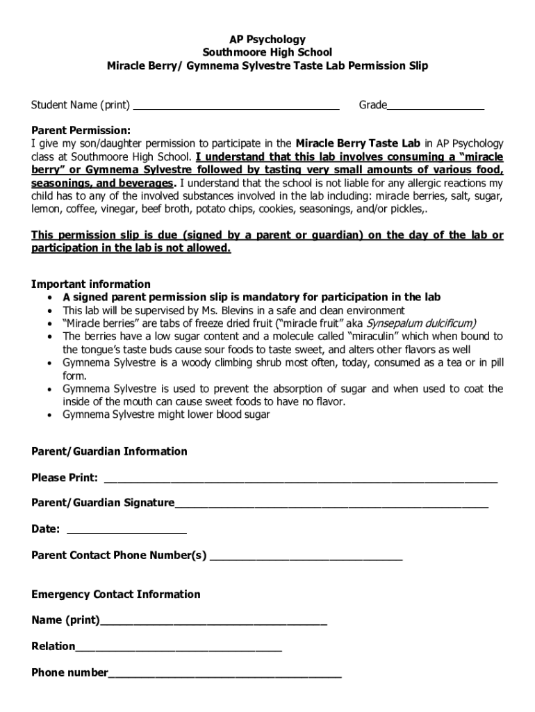 AP Psychology Sophomore High School Miracle Berry/ Cinema Sylvester Taste Lab Permission Slip Student Name (print) ___Grade___Parent Permission: I give my son/daughter permission to participate in