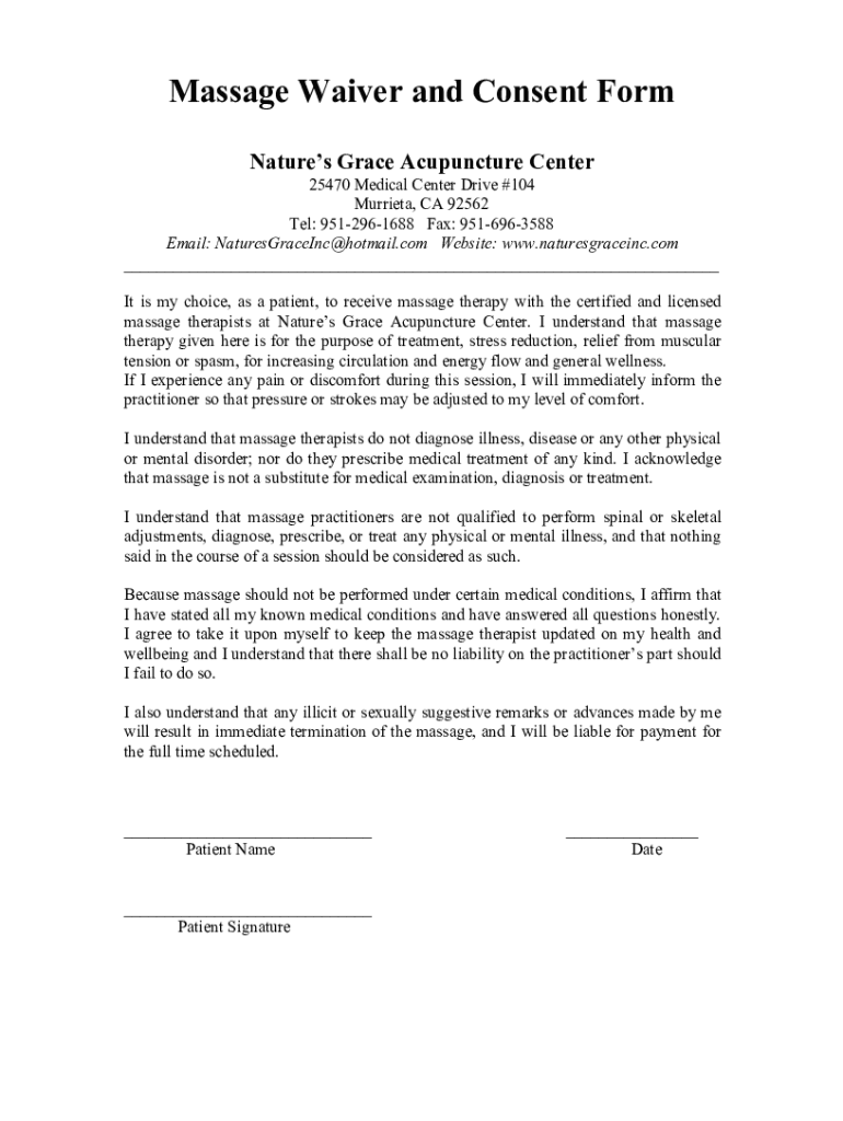 Massage Waiver and Consent Form Natures Grace Acupuncture Center25470 Medical Center Drive #104 Murrieta, CA 92562 Tel: 9512961688 Fax: 9516963588 Email: NaturesGraceInc@hotmail.com Website: www.naturesgraceinc.com