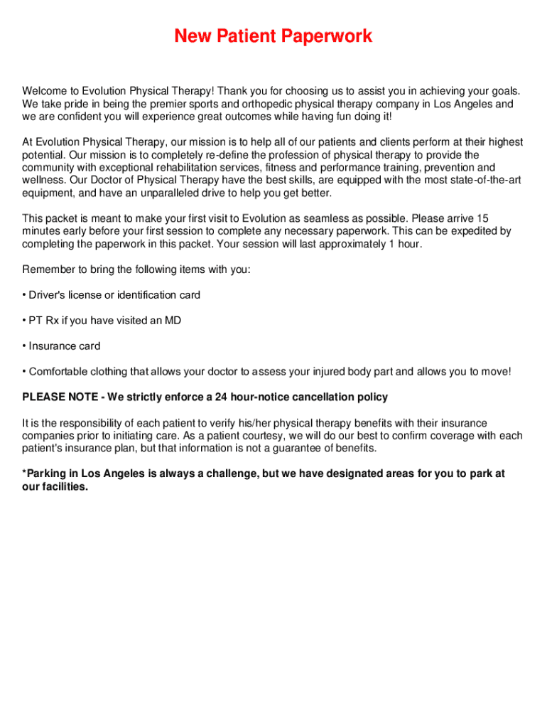 New Patient Paperwork Welcome to Evolution Physical Therapy! Thank you for choosing us to assist you in achieving your goals. We take pride in being the premier sports and orthopedic physical therapy