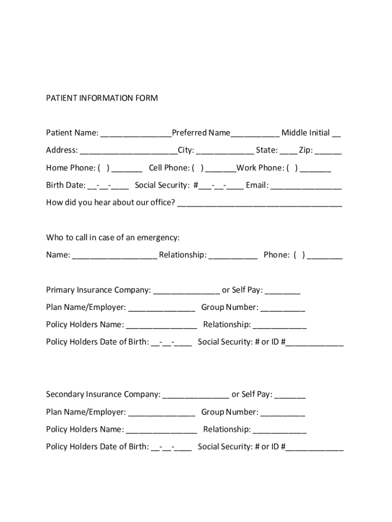 PATIENT INFORMATION Formation Name: ___Preferred Name___ Middle Initial __ Address: ___City: ___ State: ___ Zip: ___ Home Phone: () ___ Cell Phone: () ___Work Phone: () ___ Birth Date: _______ Social