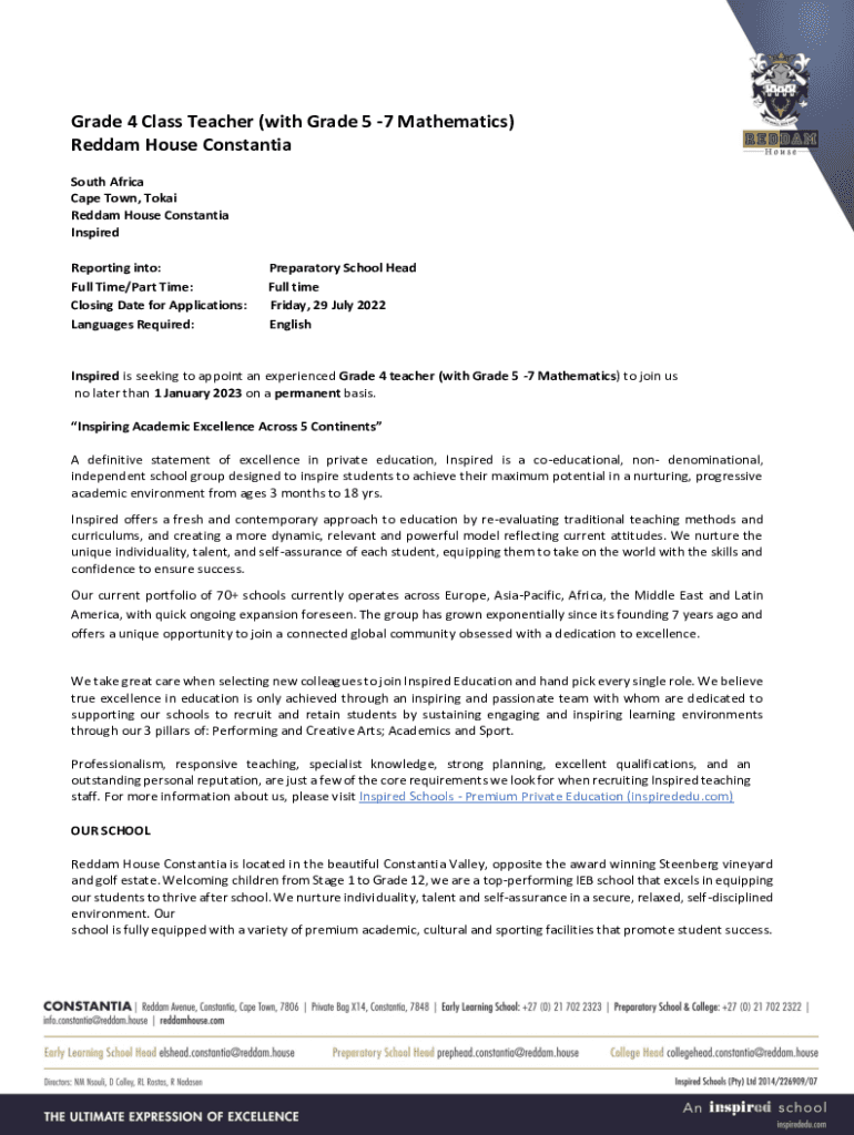 Grade 4 Class Teacher (with Grade 5 7 Mathematics) Red dam House Constancia South Africa Cape Town, Tokay Red dam House Constancia Inspired Reporting into: Full Time/Part Time: Closing Date for Applications: