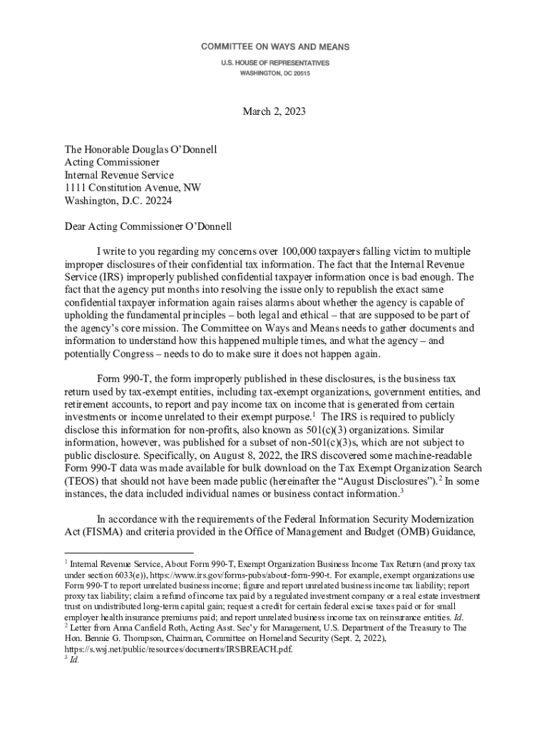 March 2, 2023, The Honorable Douglas O'Donnell Acting Commissioner Internal Revenue Service 1111 Constitution Avenue, NW Washington, D.C. 20224 Dear Acting Commissioner O'Donnell I write to you regarding