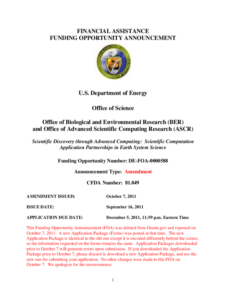 FINANCIAL ASSISTANCE FUNDING OPPORTUNITY ANNOUNCEMENT U.S. Department of Energy Office of Science Office of Biological and Environmental Research (BER) and Office of Advanced Scientific Computing