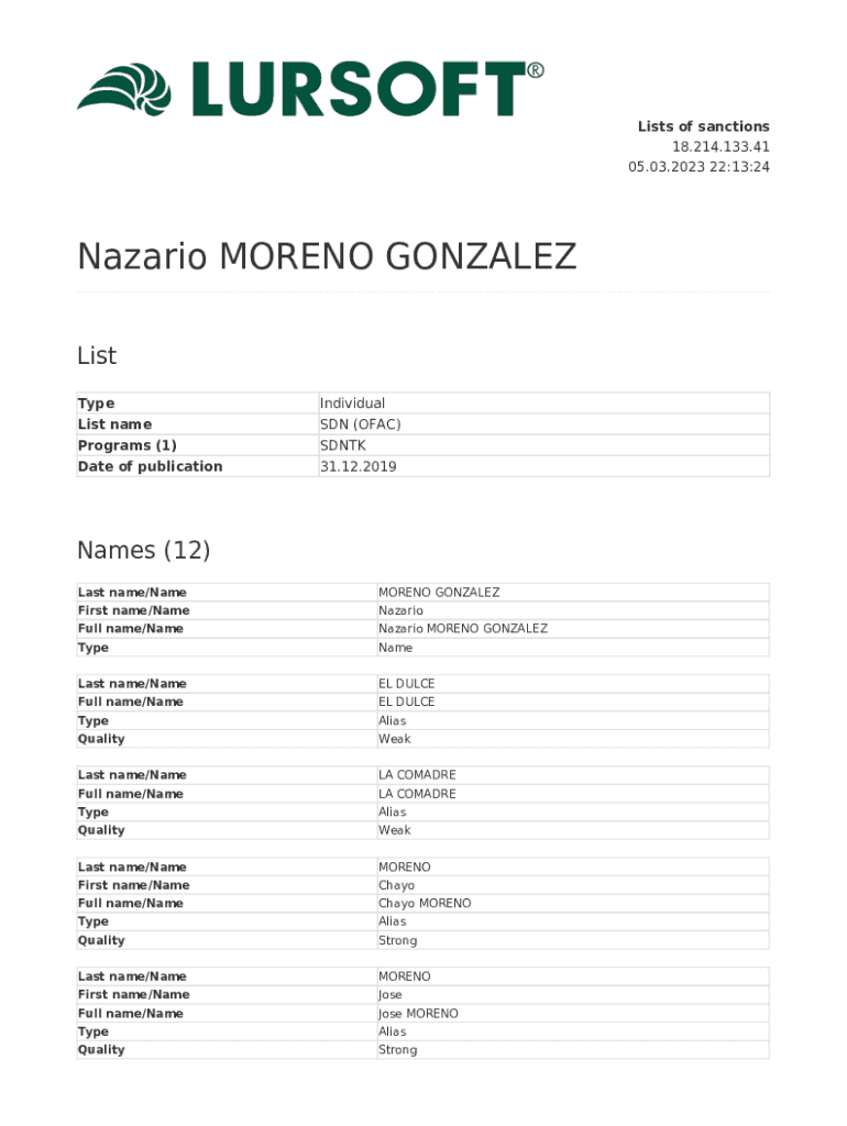Lists of sanctions 18.214.133.41 05.03.2023 22:13:24Nazario MORENO GONZALEZ List Type List name Programs (1)Individual SDN (OFAC) Antedate of publication31.12.2019Names (12) Last name/NameMORENO GONZALEZFirst