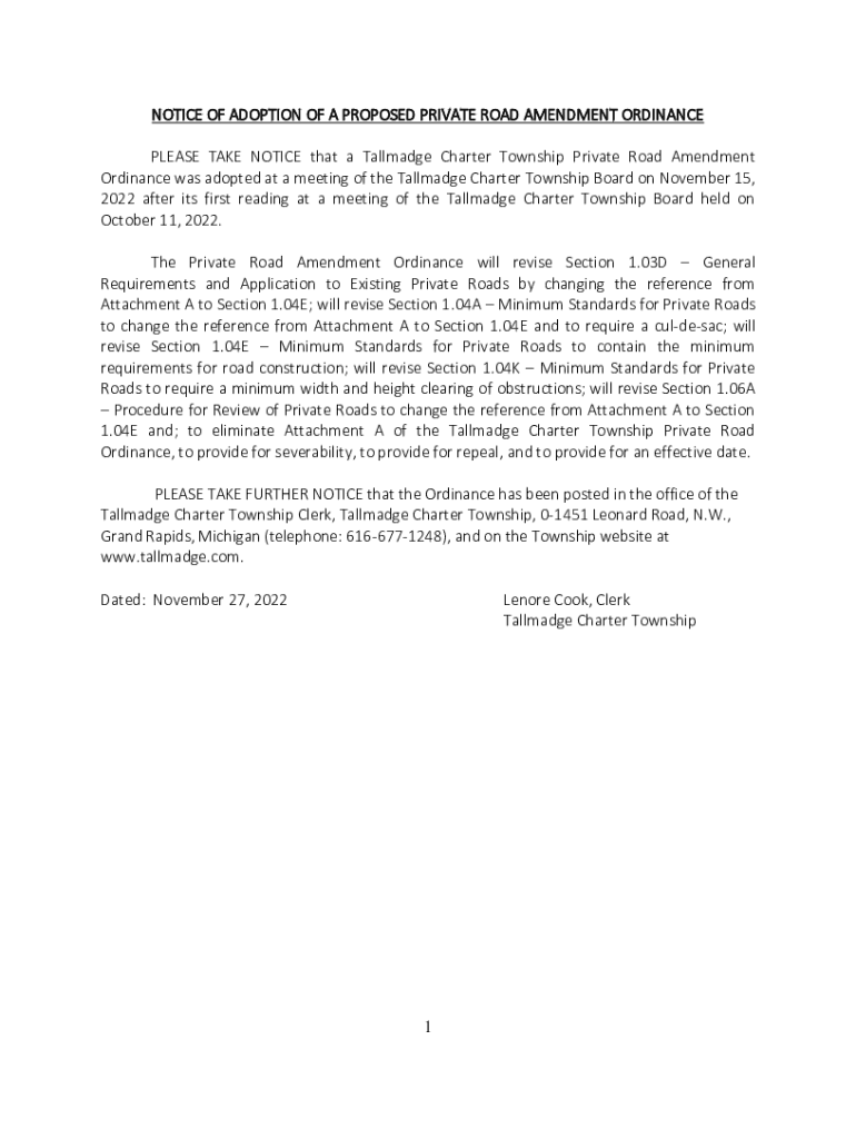 Get the free notice of adoption of a proposed private road amendment ...