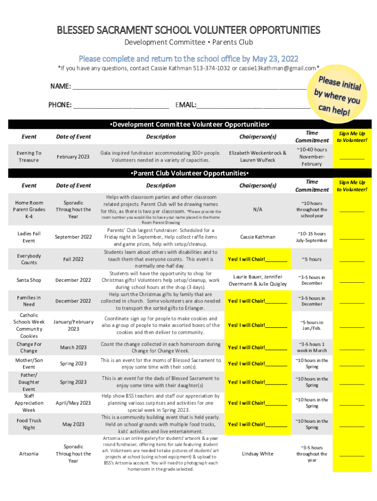BLESSED SACRAMENT SCHOOL VOLUNTEER OPPORTUNITIES Development Committee Parents Sublease complete and return to the school office by May 23, 2022 *If you have any questions, contact Cassie Batsman