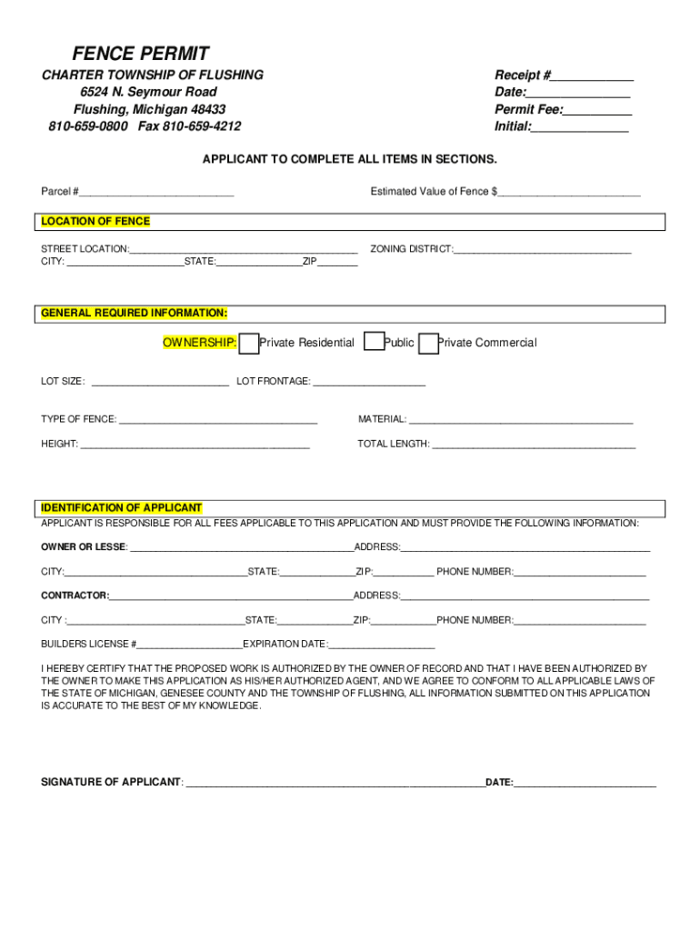 FENCE PERMIT CHARTER TOWNSHIP OF FLUSHING 6524 N. Seymour Road Flushing, Michigan 48433 8106590800 Fax 8106594212Receipt #___ Date:___ Permit Fee:___ Initial:___APPLICANT TO COMPLETE ALL ITEMS IN