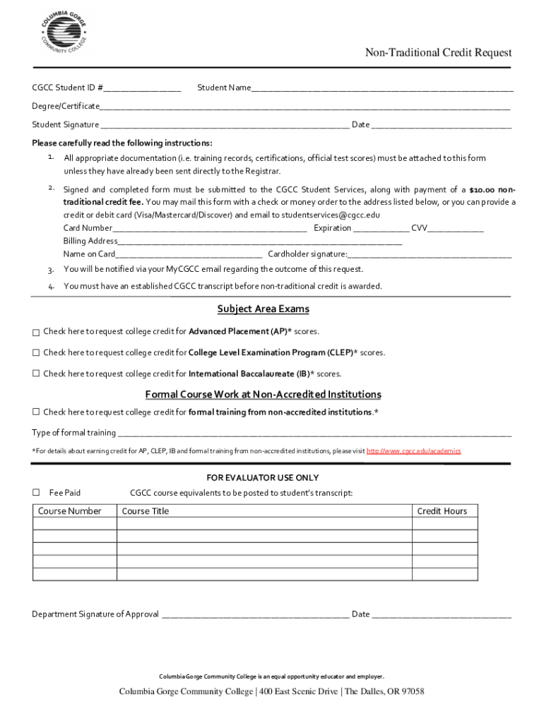 Nontraditional Credit Request CCC Student ID #___Student Name___Degree/Certificate___ Student Signature ___ Date ___ Please carefully read the following instructions: 1. All appropriate documentation