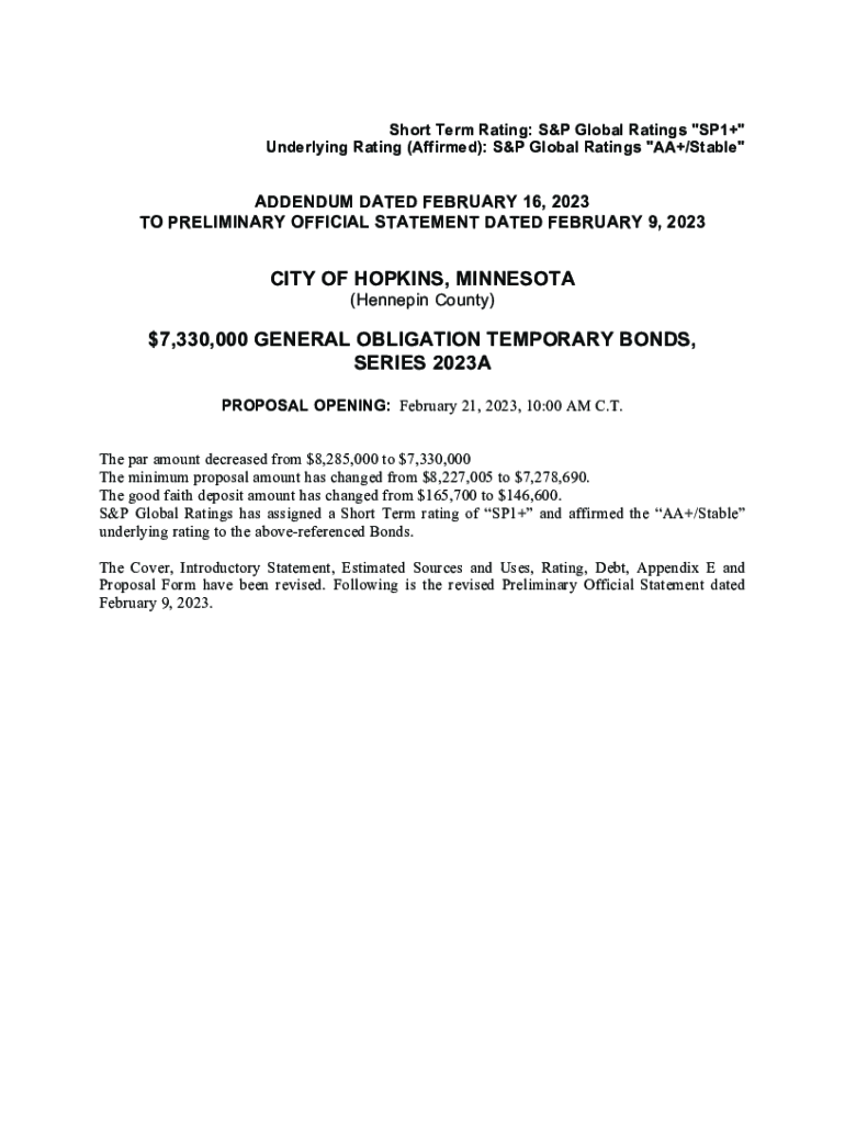 Short Term Rating: S&P Global Ratings \” SP1+\” Underlying Rating (Affirmed): S&P Global Ratings \” AA+/Stable\” ADDENDUM DATED FEBRUARY 16, 2023, TO PRELIMINARY OFFICIAL STATEMENT DATED FEBRUARY