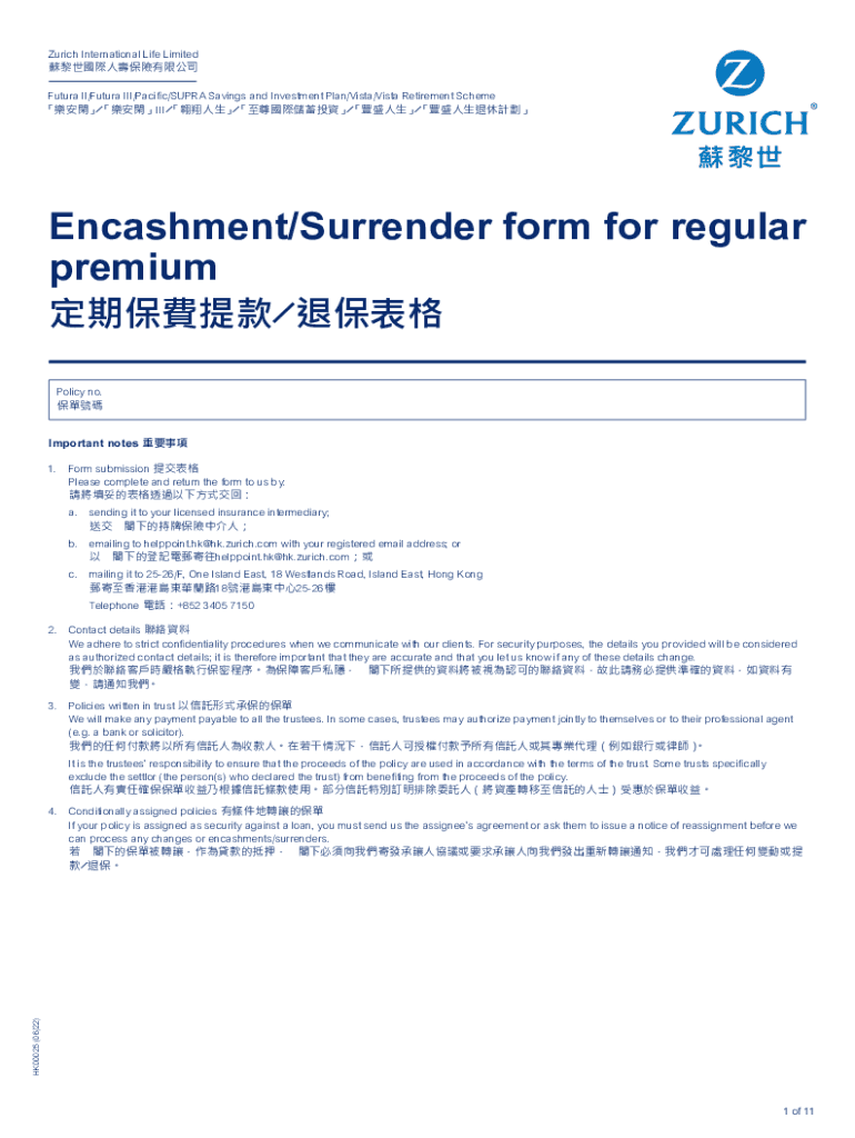 Zurich International Life Limited Future II/Future III/Pacific/SUPRA Savings and Investment Plan/Vista/Vista Retirement Scheme IIIEncashment/Surrender form for regular premium Policy no. Important
