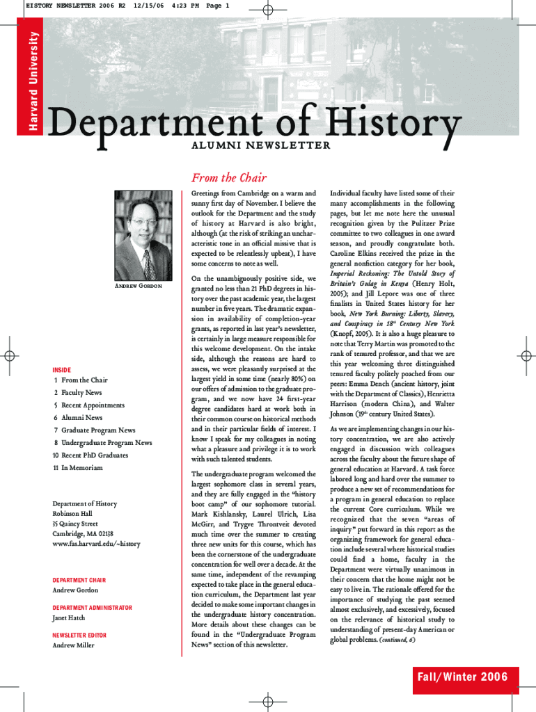 Harvard UniversityHISTORY NEWSLETTER 2006 R212/15/064:23 PM Page 1Department of History alumni newsletter From the Chair Greetings from Cambridge on a warm and sunny RST day of November. I believe