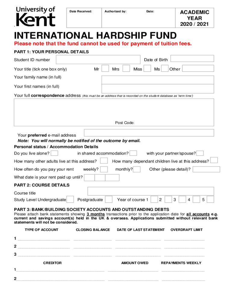 Authorized by:Date Received:Date:ACADEMIC YEAR 2020 / 2021×INTERNATIONAL HARDSHIP FUND Please note that the fund cannot be used for payment of tuition fees. PART 1: YOUR PERSONAL DETAILS Student