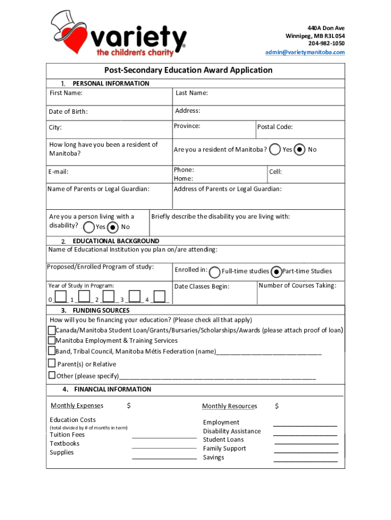 Variety Manitoba PostSecondary Education Awards Value: Number of Awards: Eligibility: Varies, between $2,000 and $4,000 per award Varies, based on award valueApplicant must be living with a permanent