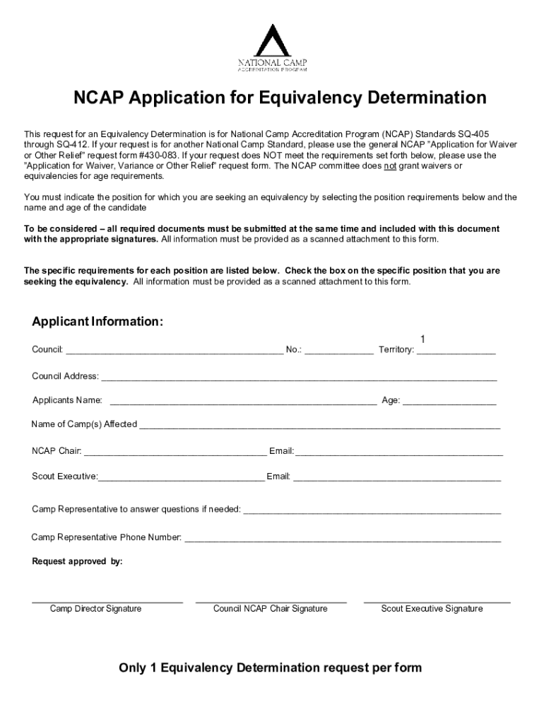 NCAP Application for Equivalency Determination This request for an Equivalency Determination is for National Camp Accreditation Program (NCAP) Standards SQ405 through SQ412. If your request is for