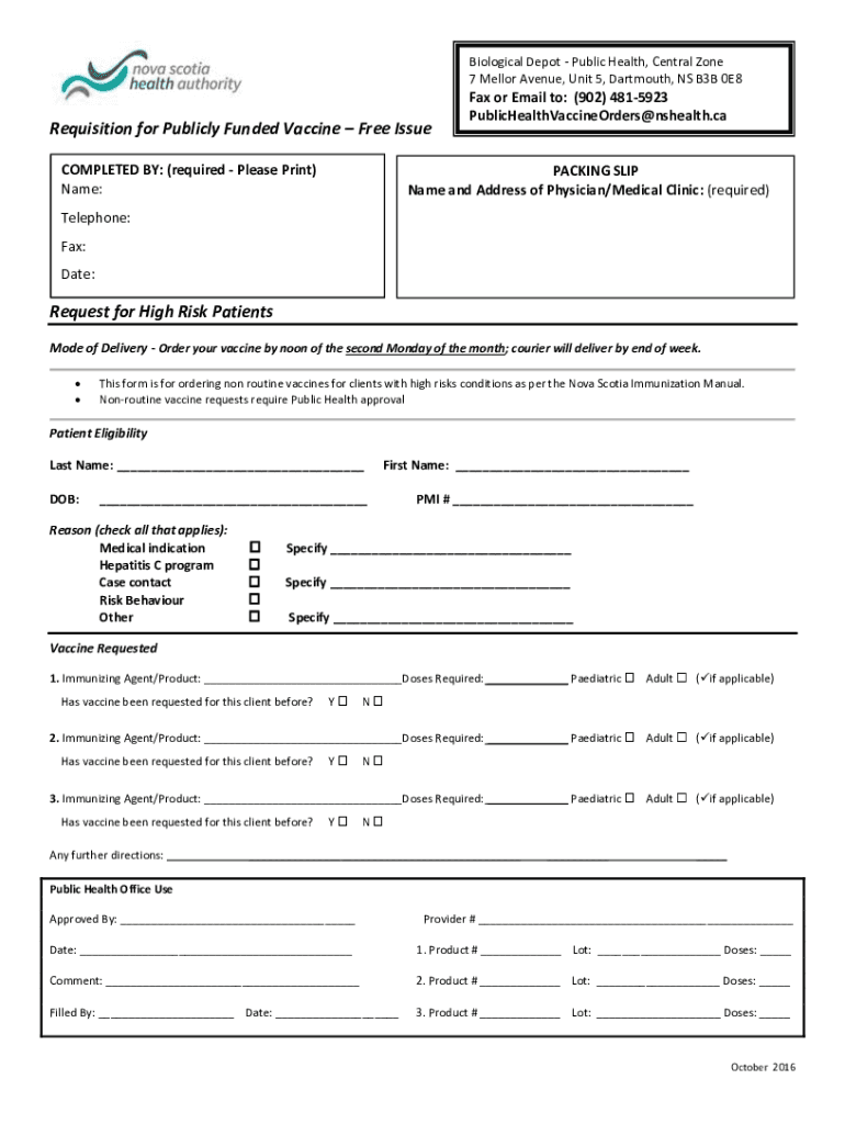 Biological Depot Public Health, Central Zone 7 Mellor Avenue, Unit 5, Dartmouth, NS B3B 0E8Requisition for Publicly Funded Vaccine Free Issue COMPLETED BY: (required Please Print) (Please Print) Name:Fax