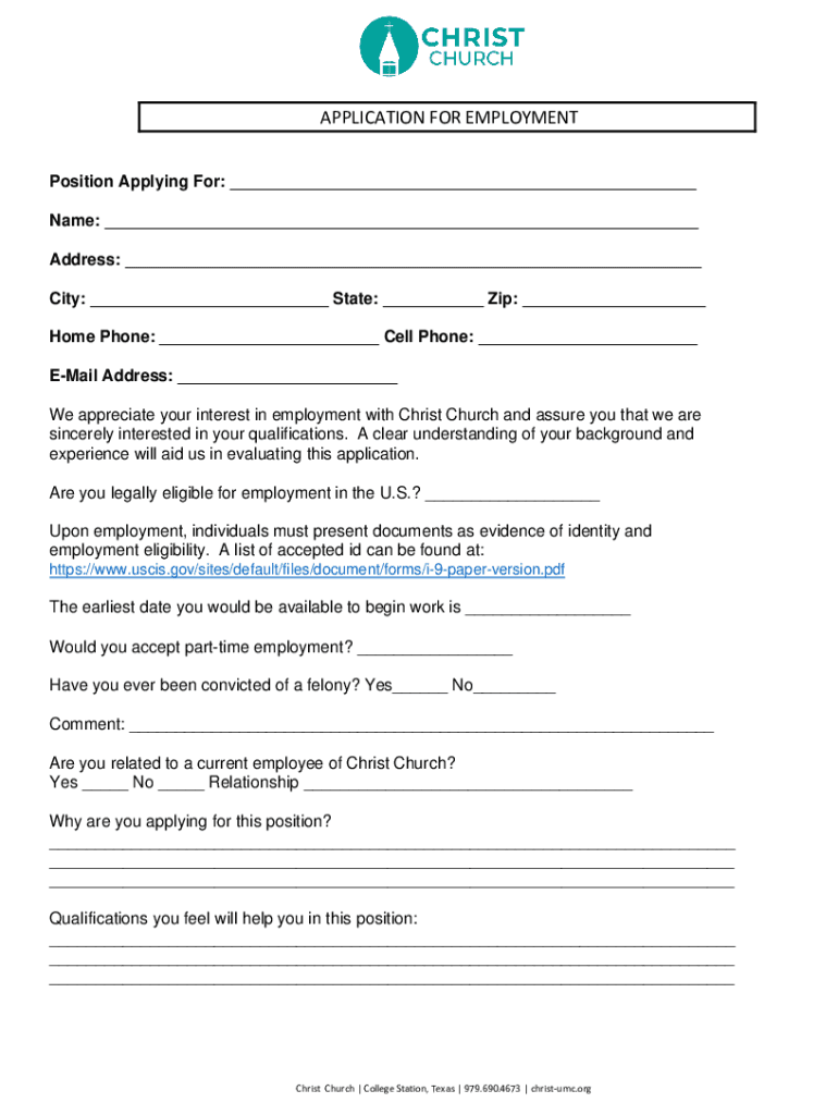 APPLICATION FOR EMPLOYMENT Position Applying For: ___ Name: ___ Address: ___ City: ___ State: ___ Zip: ___ Home Phone: ___ Cell Phone: ___ Email Address: ___ We appreciate your interest in employment