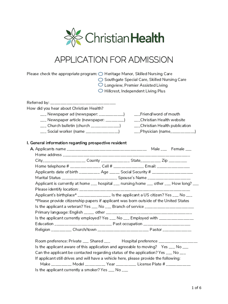 APPLICATION FOR ADMISSION Please check the appropriate program:Heritage Manor, Skilled Nursing Care Southgate Special Care, Skilled Nursing Care Longview, Premier Assisted Living Hillcrest, Independent