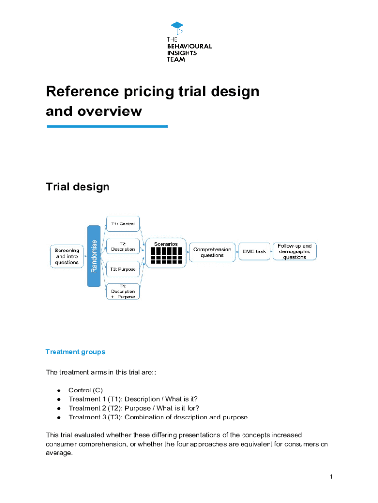 Reference pricing trial design and overviewTrial designTreatment groups The treatment arms in this trial are:: Control © Treatment 1 (T1): Description / What is it? Treatment 2 (T2): Purpose / What