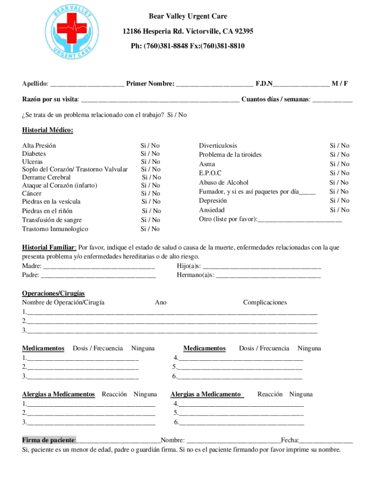 Bear Valley Urgent Care 12186 Hesperia Rd. Victorville, CA 92395 pH: (760)3818848 FX:(760)3818810Apellido: ___ Primer Hombre: ___ F.D. N___ M / F Ran POR SU visit: ___ Cantos was / demands: ___ Se