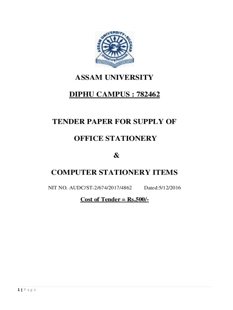 ASSAM UNIVERSITY DIP HU CAMPUS : 782462TENDER PAPER FOR SUPPLY OF OFFICE STATIONERY & COMPUTER STATIONERY ITEMS NIT NO. ADC/ST2/674/2017/4862Dated:5/12/2016Cost of Tender Rs.500/1|P age BIDDERS DETAILS1.2.