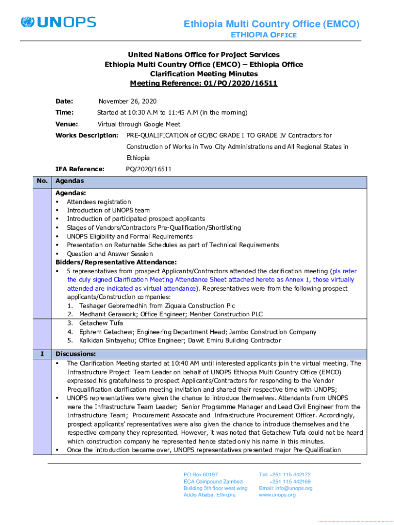 Ethiopia Multi Country Office (ECO) ETHIOPIA OFFICE United Nations Office for Project Services Ethiopia Multi Country Office (ECO) Ethiopia Office Clarification Meeting Minutes Meeting Reference: