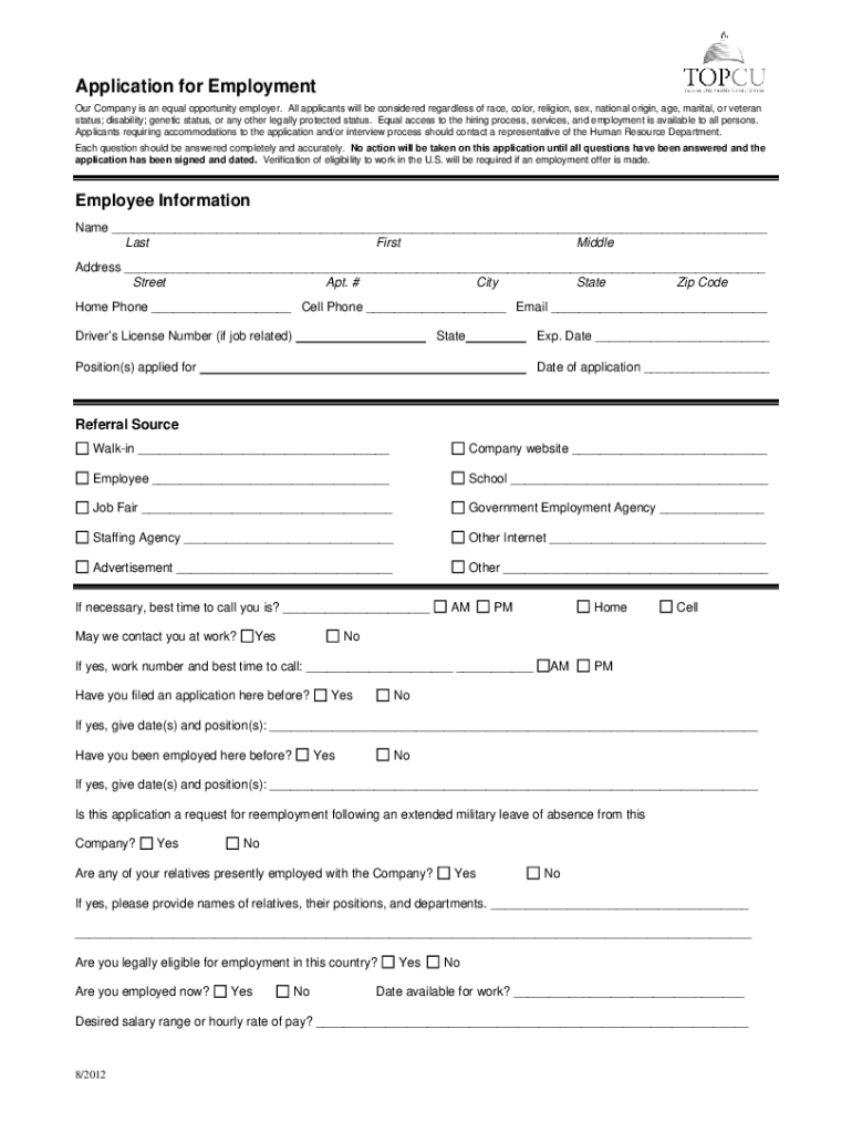 Application for Employment Our Company is an equal opportunity employer. All applicants will be considered regardless of race, color, religion, sex, national origin, age, marital, or veteran status;