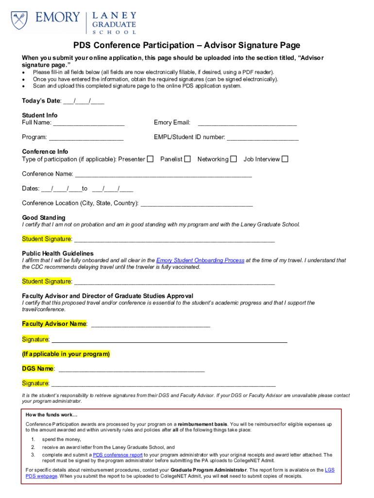 PDS Conference Participation Advisor Signature Page When you submit your online application, this page should be uploaded into the section titled, Advisor signature page. Please fill all fields below