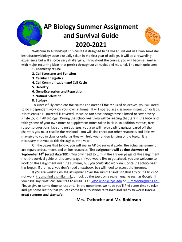 AP Biology Summer Assignment and Survival Guide 20202021 Welcome to AP Biology! This course is designed to be the equivalent of a two semester introductory biology course usually taken in the first