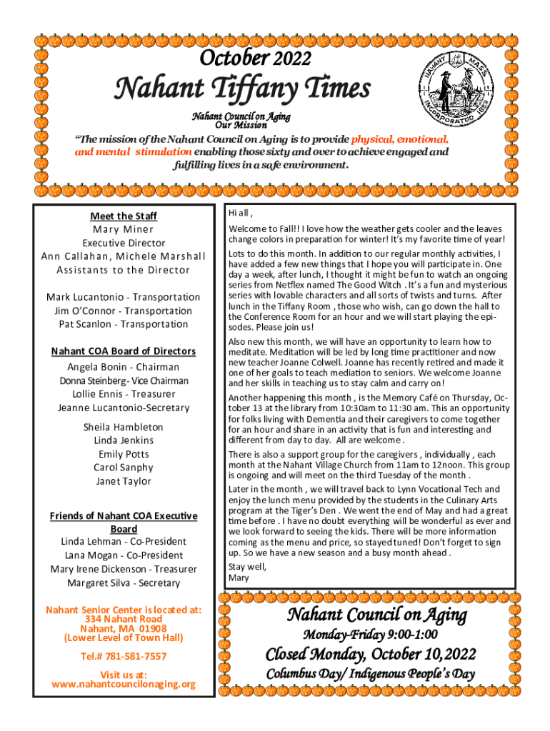 October 2022Nahant Tiffany Times Nah ant Council on Aging Our Mission The mission of the Nah ant Council on Aging is to provide physical, emotional, and mental stimulation enabling those sixty and