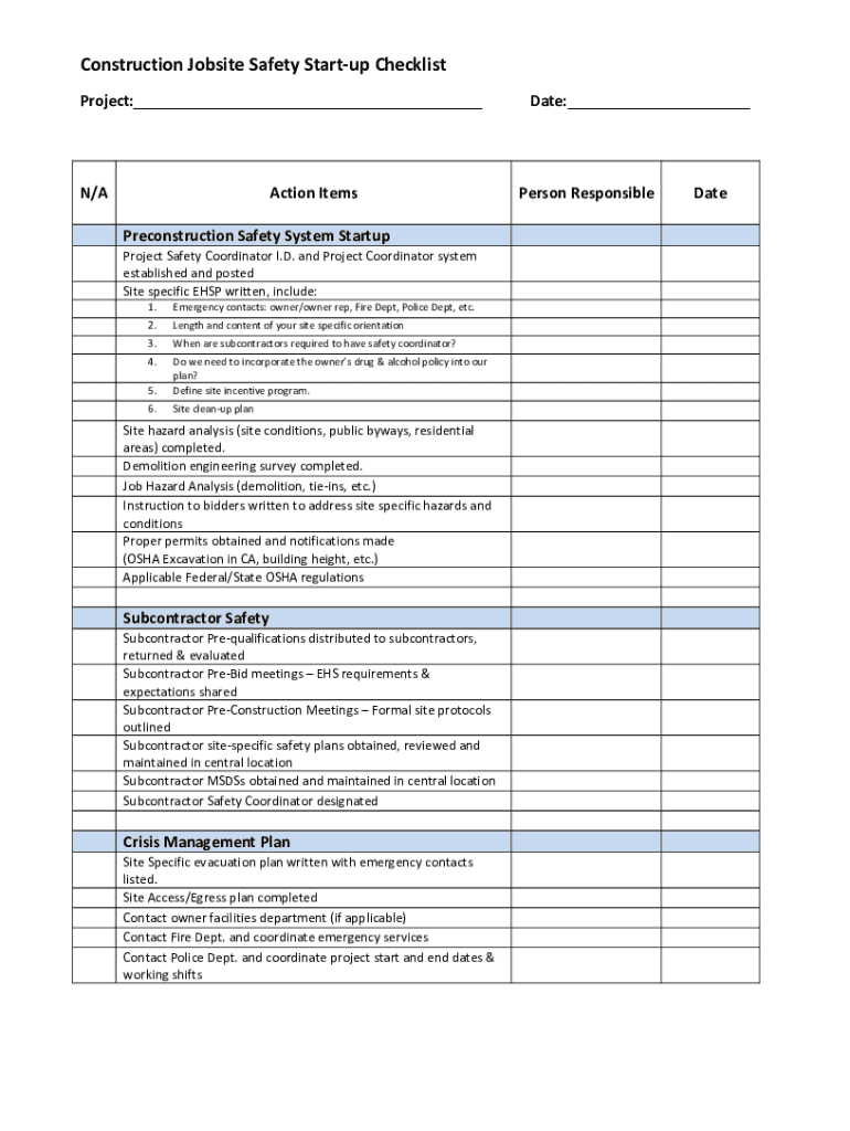 Construction Job site Safety Startup Checklist Project:___N/Action Items Preconstruction Safety System StartupProject Safety Coordinator I.D. and Project Coordinator system established and posted