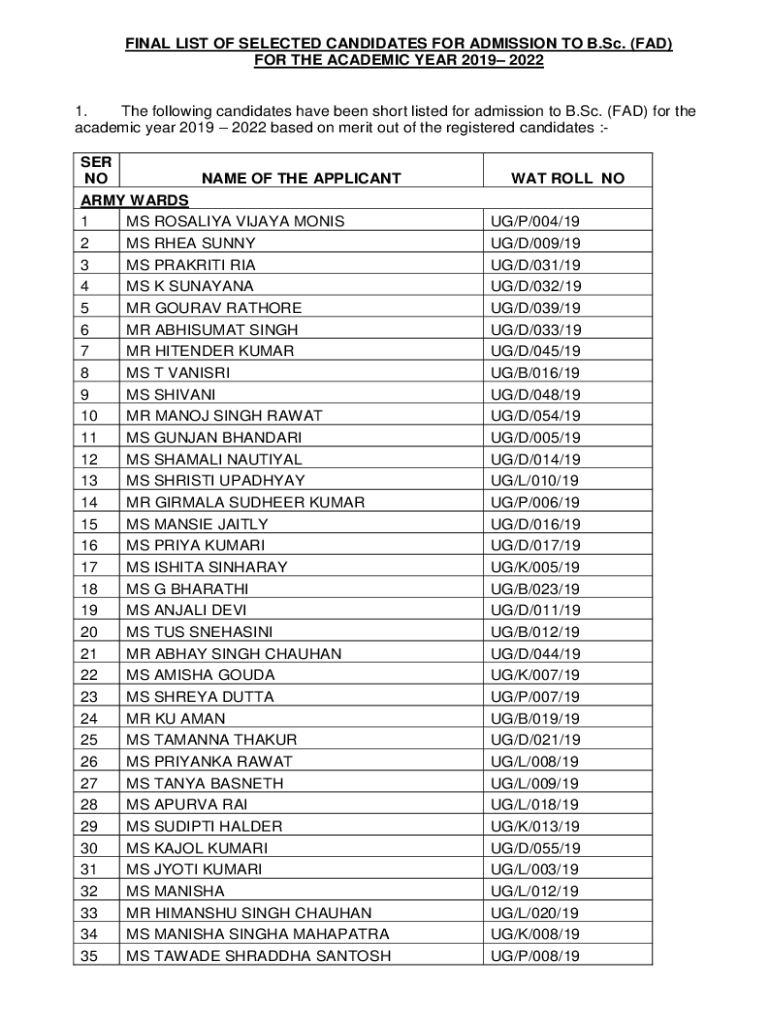 FINAL LIST OF SELECTED CANDIDATES FOR ADMISSION TO B.Sc. (FAD) FOR THE ACADEMIC YEAR 2019 20221. The following candidates have been shortlisted for admission to B.Sc. (FAD) for the academic year 2019