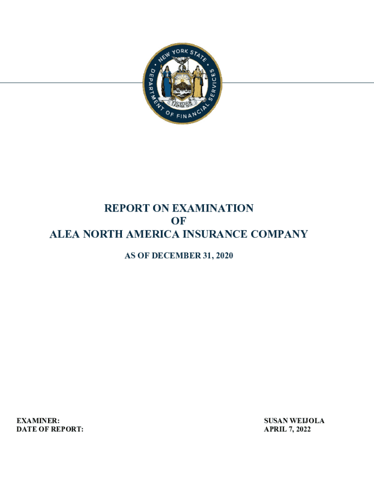 REPORT ON EXAMINATION OF AREA NORTH AMERICA INSURANCE COMPANY AS OF DECEMBER 31, 2020EXAMINER: DATE OF REPORT:SUSAN EIDOLA APRIL 7, 2022TABLE OF CONTENTS IMAGE NO.1. Scope of examination22. Description