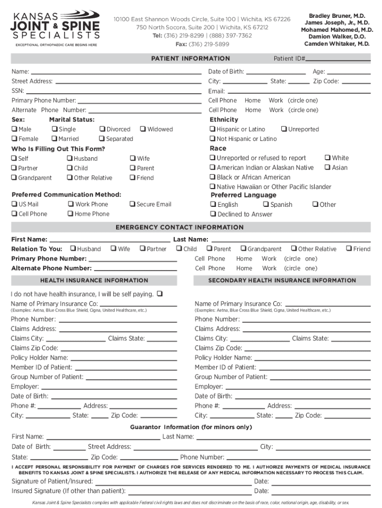 Kansas Spine Hospital patient information can be filled out electronically or via paper forms provided by the hospital.