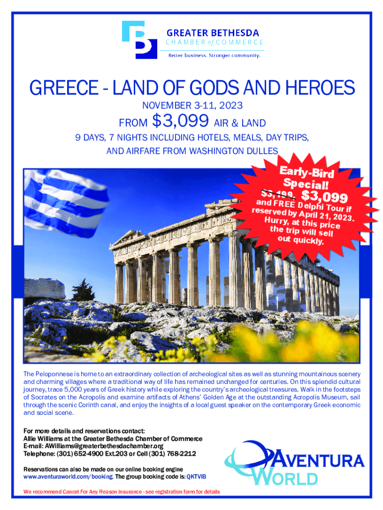 GREECE LAND OF GODS AND HEROES NOVEMBER 311, 2023FROM$3,099 AIR & LAND9 DAYS, 7 NIGHTS INCLUDING HOTELS, MEALS, DAY TRIPS, AND AIRFARE FROM WASHINGTON DULLESEarlyBird Special!$3,199,$3,099and FREE