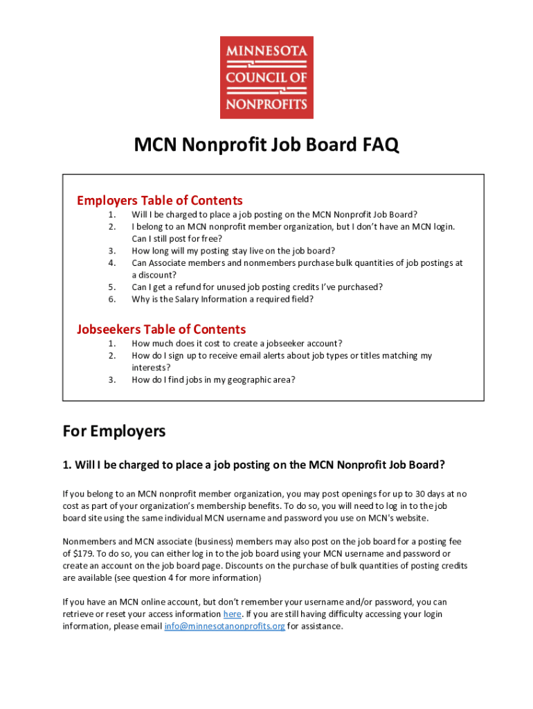 MAN Nonprofit Job Board FAQ Employers Table of Contents 1. 2. 3. 4. 5. 6. Will I be charged to place a job posting on the MAN Nonprofit Job Board? I belong to an MAN nonprofit member organization,