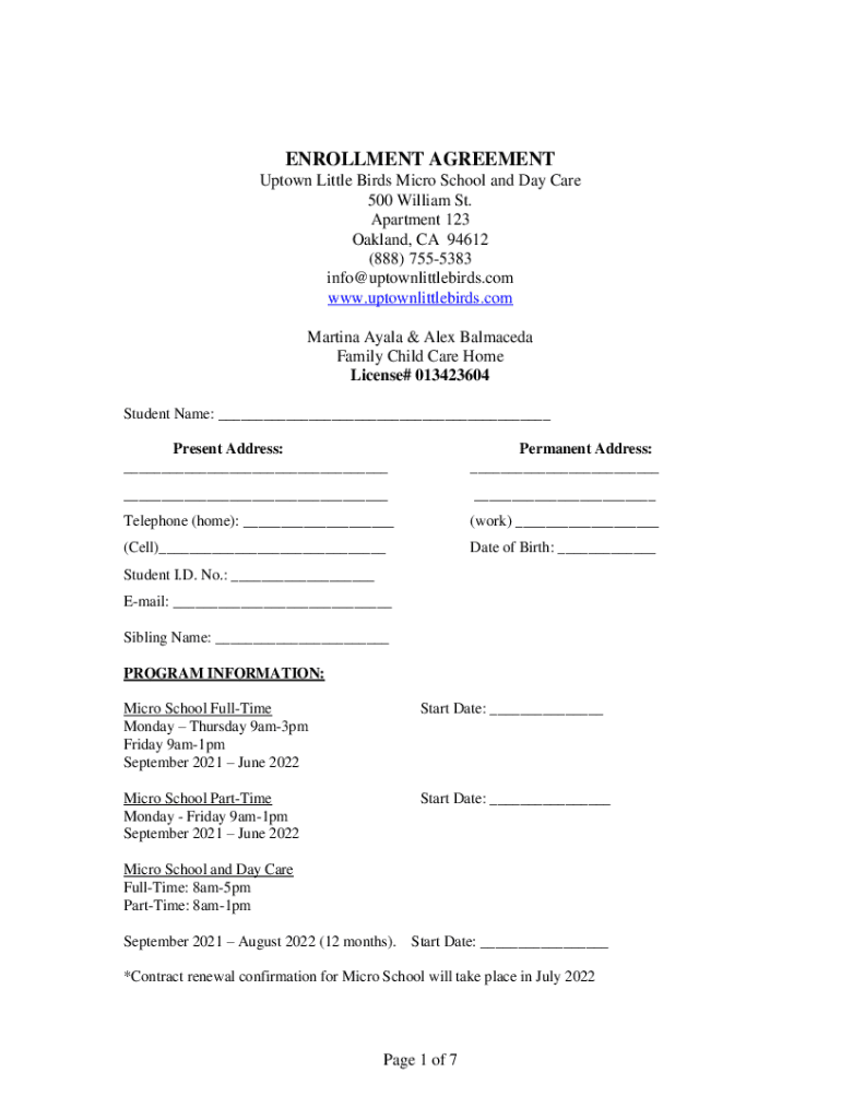 ENROLLMENT AGREEMENT Uptown Little Birds Micro School and Day Care 500 William St. Apartment 123 Oakland, CA 94612 (888) 7555383 info@uptownlittlebirds.com www.uptownlittlebirds.com Martina Ayala