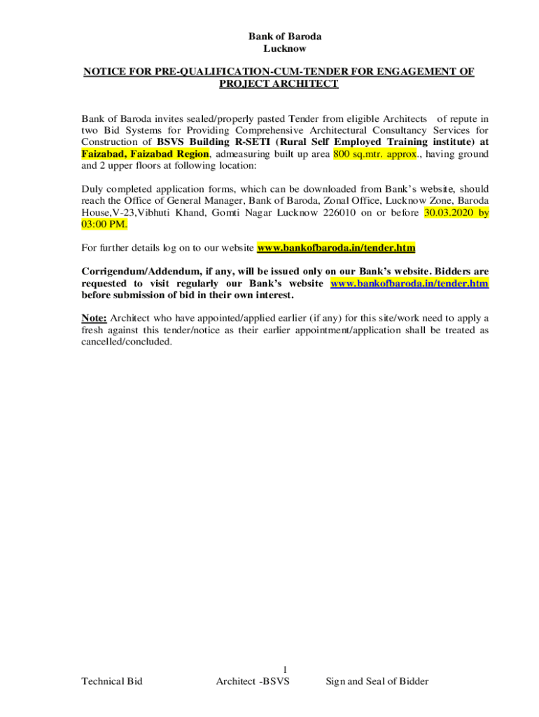 Bank of Baroda Lucknow NOTICE FOR PREQUALIFICATIONCUMTENDER FOR ENGAGEMENT OF PROJECT Architecting of Baroda invites sealed/properly pasted Tender from eligible Architects of repute in two Bid Systems