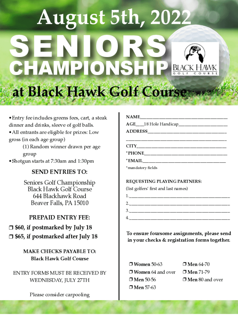 August 5th, 2022SENIORSCHAMPIONSHIP at Black Hawk Golf Course Entry fee includes greens fees, cart, a steak dinner and drinks, sleeve of golf balls. All entrants are eligible for prizes: Low gross