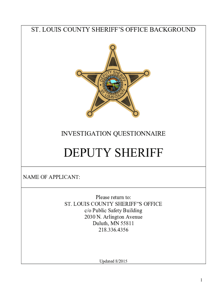 ST. LOUIS COUNTY SHERIFFS OFFICE BACKGROUNDINVESTIGATION QUESTIONNAIREDEPUTY SHERIFF NAME OF APPLICANT: Please return to: ST. LOUIS COUNTY SHERIFFS OFFICE c/o Public Safety Building 2030 N. Arlington