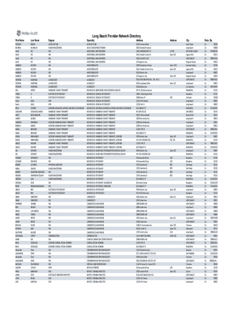 Long Beach Provider Network Directory First Nameless NameDegreeSpecialtyAddressSOCHEAT KATRINA ALAN ANDREW STEPHEN STEPHEN STEPHEN LISA TORN David TRUE CAROLINA JANET AARON ANDREA KEISHA NADIA EMMA