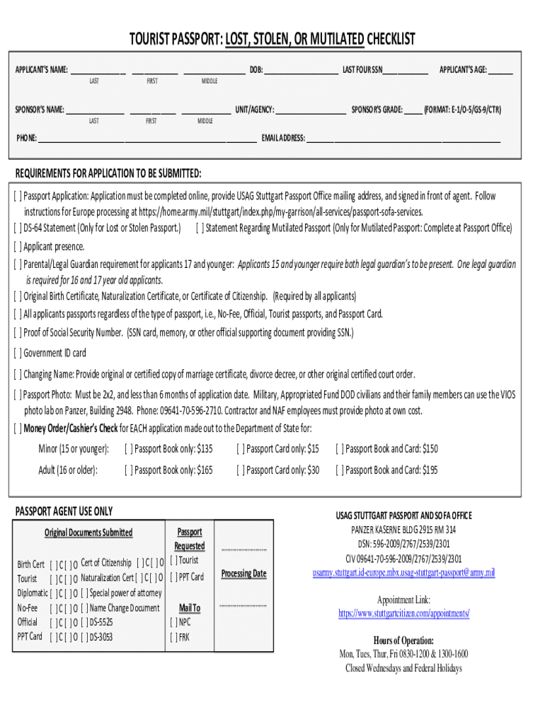 TOURIST PASSPORT: LOST, STOLEN, OR MUTILATED CHECKLIST APPLICANTS NAME: ___ ___ ___ DOB: ___ LAST FOUR SSN___ LASTFIRSTAPPLICANTS AGE: ___MIDDLESPONSORS NAME: ___ ___ ___ UNIT/AGENCY: ___ SPONSORS