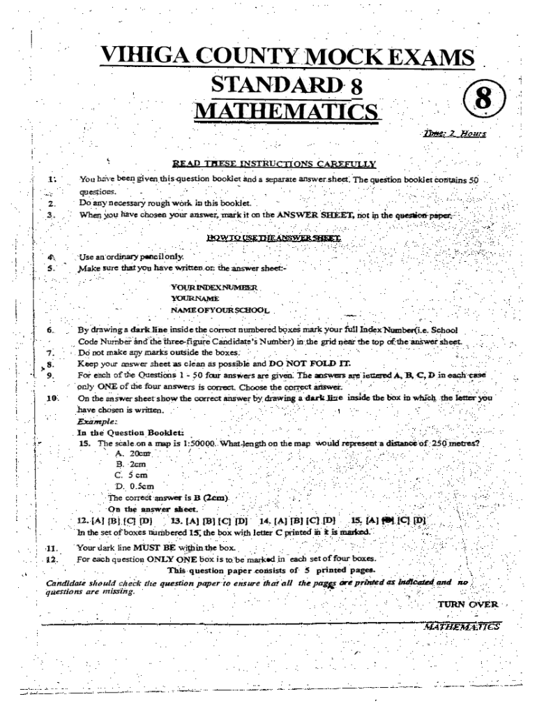 Villa.COUNTY.:MOCKERIES STANDARD 8 8_. . I t!;J MATHEMATICS for\'_._.BEAD THESE INSTRUCTIONS Cairo/:FFJ,LY2. . 3.4s. You hive beef! Give nth’s question booklet and a. separate answer. Sheet. The