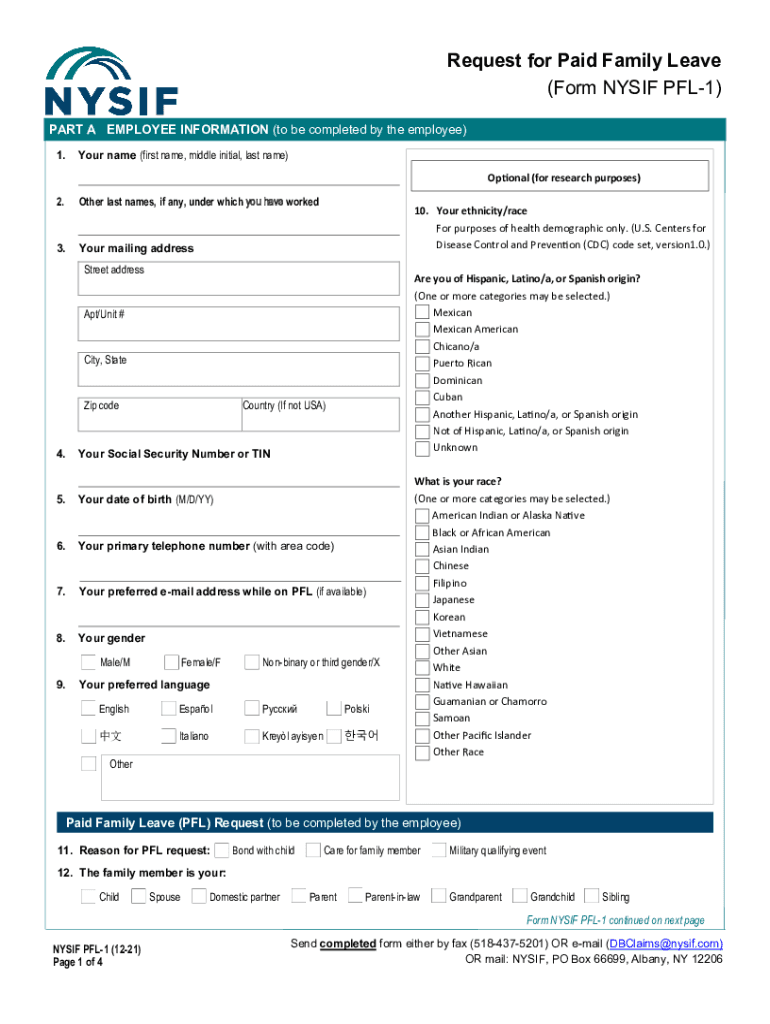 PFL form - request is a form used to request Paid Family Leave benefits from the State.