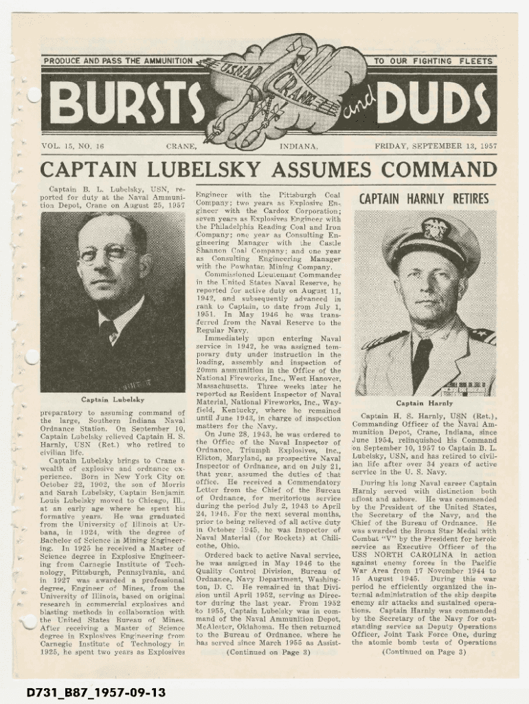 Captain B. L. Labels, USN, reported for duty at the Naval Ammunition Depot, Crane on August 25, 1957Captain Labels, .,.preparatory to assuming command